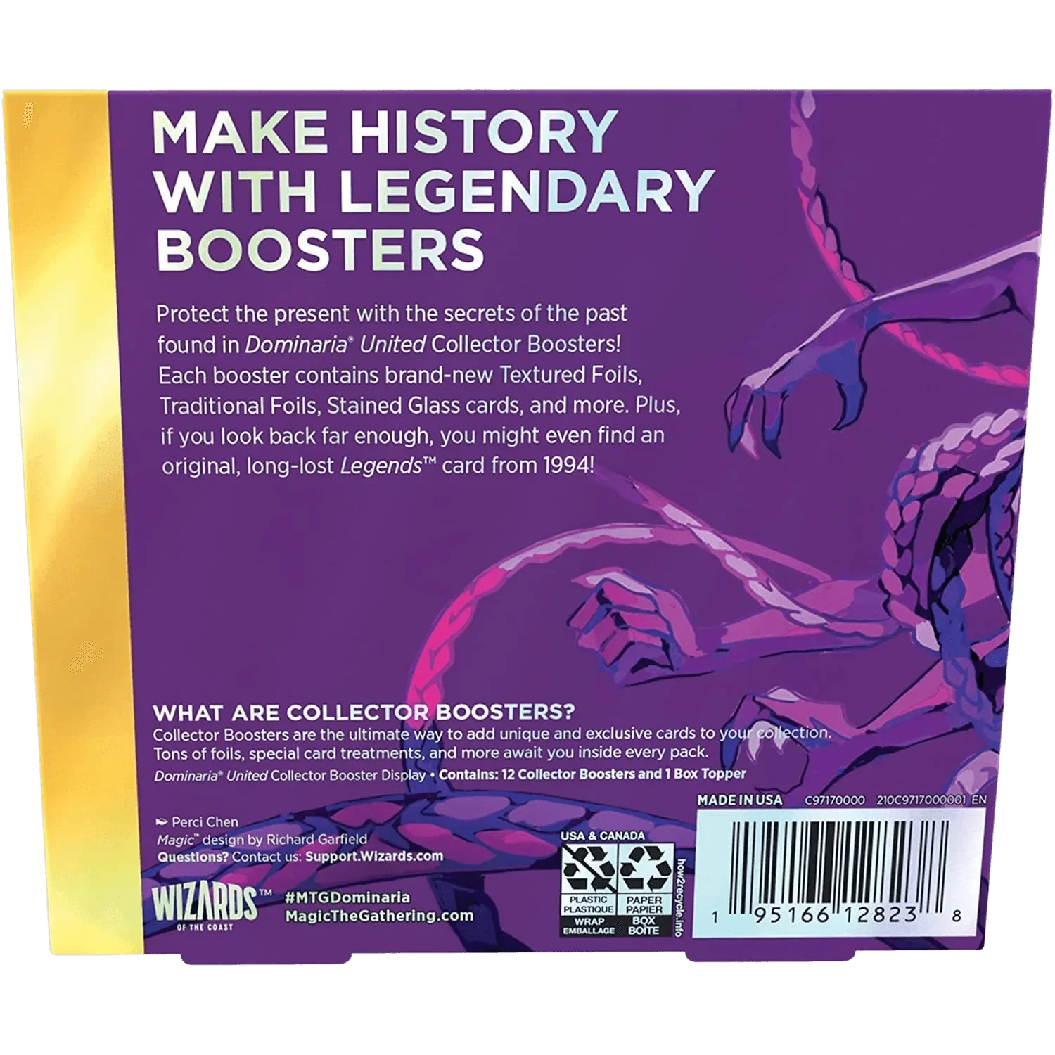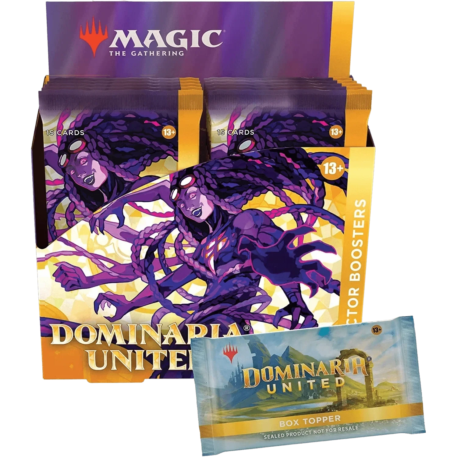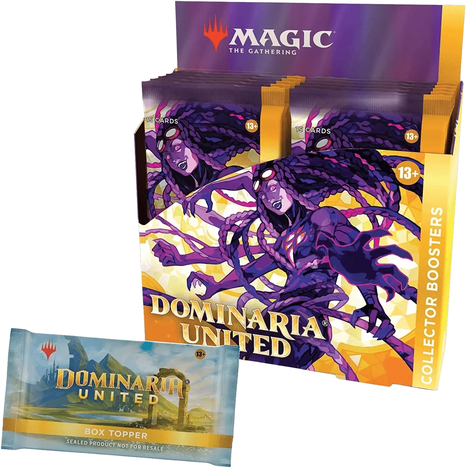 The Dominaria United Collector Booster Box contains 12 Dominaria United Collector Boosters and 1 Traditional Foil Box Topper card. Each Collector Booster contains 15 Magic: The Gathering cards and 1 Traditional Foil double-sided token, with a combination of 5–6 cards of rarity Rare or higher and 4–5 Uncommon, 4 Common, and 1 Land cards, with a total of 10–13 foil cards. Foil Borderless Mythic Rare Planeswalker in 2% of boosters