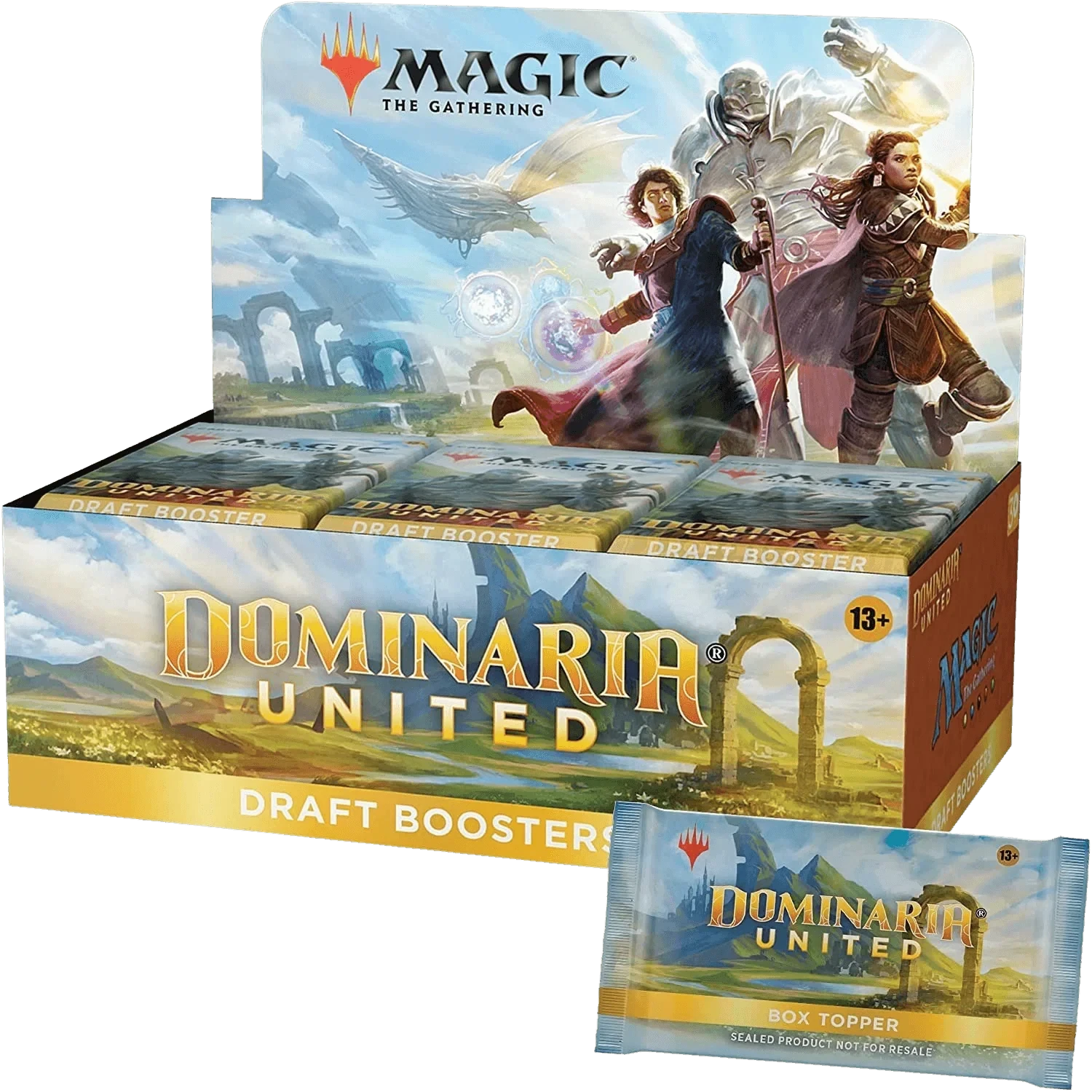 The Draft Booster Display contains 36 Dominaria United Draft Boosters and 1 Traditional Foil Box Topper card. Each Draft Booster contains 15 cards and 1 token card, including a combination of 1 card of rarity Rare or higher and 3 Uncommon, 10 Common, and 1 Land cards. There is also a chance to find a traditional Foil Borderless Mythic Planeswalker in <1% of boosters. Traditional Foil of any rarity replaces a Common in 33% of boosters.