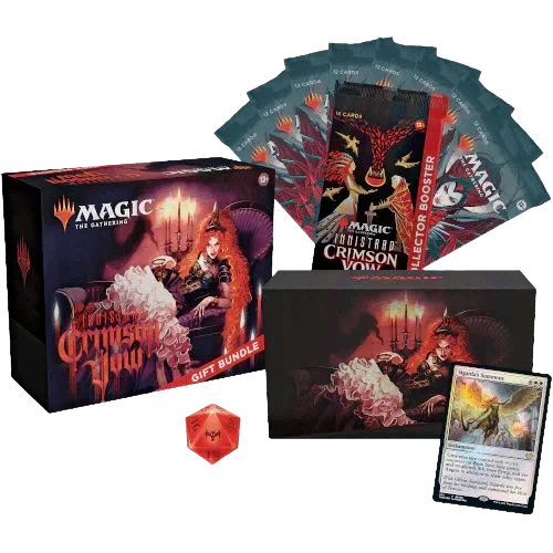 The Innistrad: Crimson Vow Gift Bundle contains 8 Innistrad: Crimson Vow Set Boosters, 1 Innistrad: Crimson Vow Collector Booster, 40 basic lands (20 traditional foils and 20 nonfoils), 1 traditional foil promo card with Bundle-exclusive alternate-art—Sigarda’s Summons, 1 oversized Spindown life counter, 1 card storage box, and 2 reference cards.