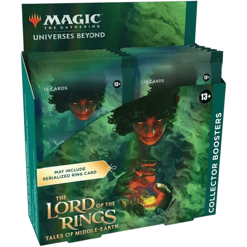 Each The Lord of the Rings: Tales of Middle-earth Collector Booster contains 15 Magic: The Gathering cards and 1 Traditional Foil double-sided token, with a combination of 5–7 cards of rarity Rare or higher and 3–5 Uncommon, 3–6 Common, and 1 Land cards. Every pack contains a total of 8–10 Traditional Foil cards.
