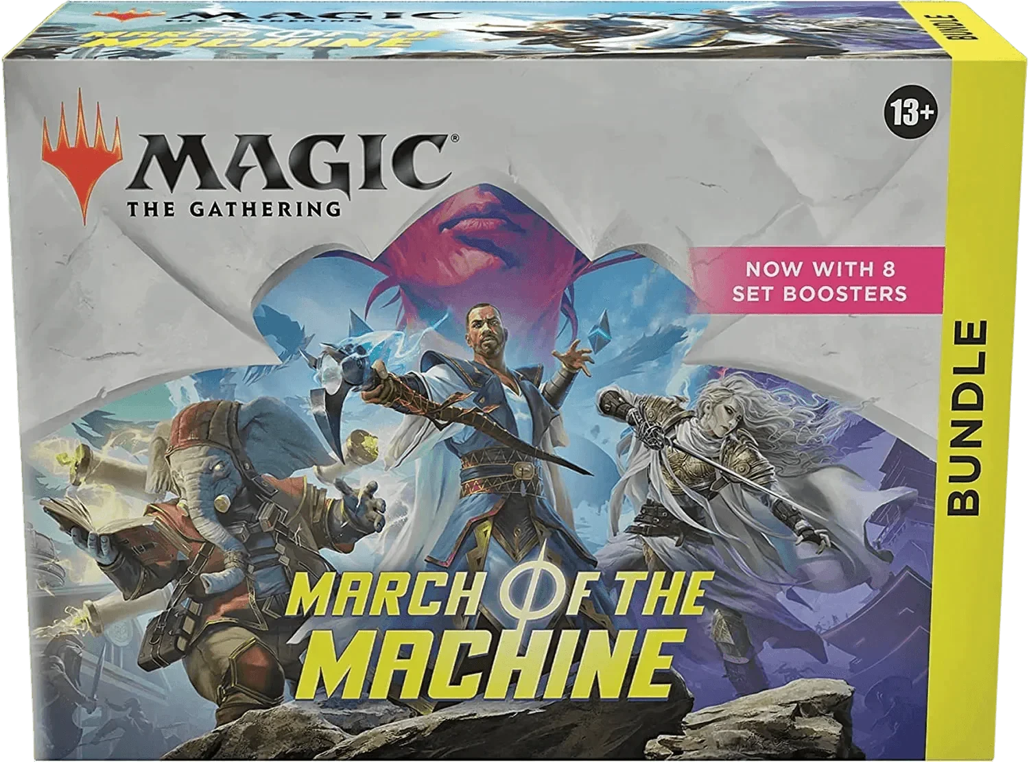 The March of the Machine Bundle contains 8 March of the Machine Set Boosters—the best boosters to open just for fun—plus accessories, with 1 traditional foil alternate-art promo card, 40 basic lands (20 traditional foils and 20 nonfoils), 1 oversized Spindown life counter, 1 card storage box, and 2 reference cards.