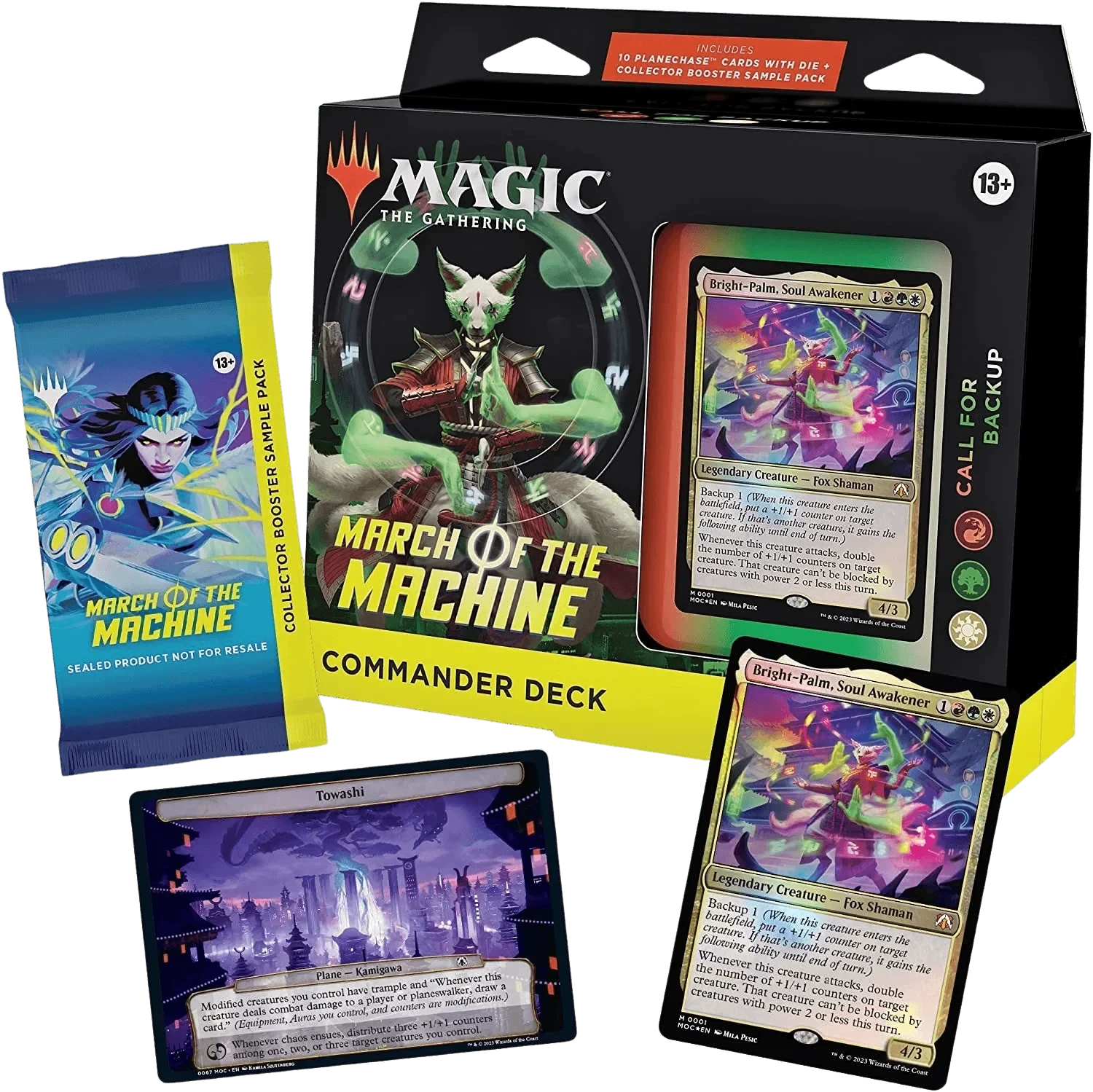 This March of the Machine Commander Deck set includes 1 ready-to-play deck of 100 Magic cards (2 Traditional Foil Legendary cards, 98 nonfoil cards), 10 specialty cards, a 2-card Collector Booster Sample Pack, 1 Foil-Etched Display Commander (a thick cardstock copy of the commander card with foil etched into the card’s border and art), 10 double-sided tokens, 1 deck box (can hold 100 sleeved cards), 1 Life Wheel, 1 special die, 1 strategy insert, and 1 reference card.