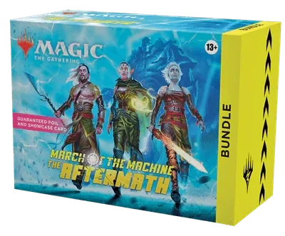 The March of the Machine: The Aftermath Bundle contains 8 March of the Machine: The Aftermath Epilogue Boosters—lore-packed boosters that continue the story in between sets, with a guaranteed foil and Showcase card in every pack—plus accessories, with 1 traditional foil alternate-art promo card, 40 basic lands (20 traditional foils and 20 nonfoils), 1 oversized Spindown life counter, 1 card storage box, and 2 reference cards.
