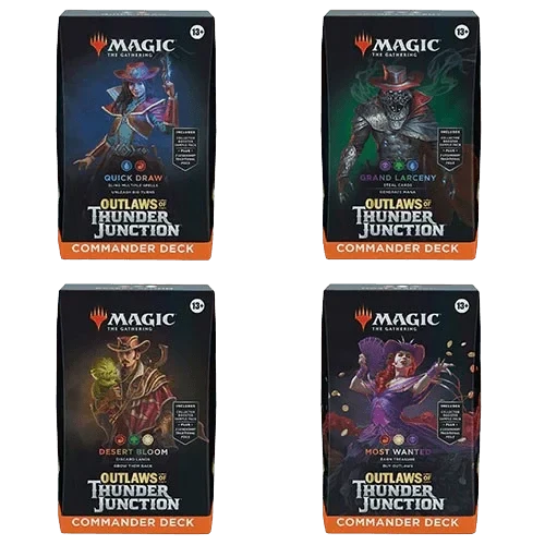 In Commander, four players come together to show their strength and strategy, with one player coming out on top. Each 100-card ready-to-play Outlaws of Thunder Junction Commander Deck makes it easy for Commander fans in your store to grab a deck and play right away.