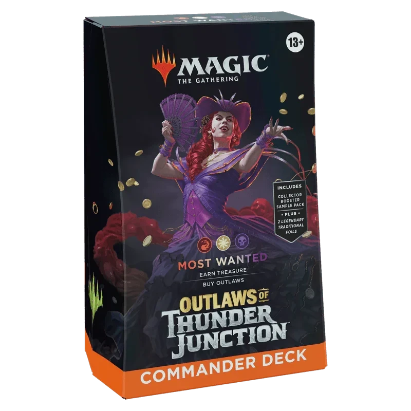 In Commander, four players come together to show their strength and strategy, with one player coming out on top. Each 100-card ready-to-play Outlaws of Thunder Junction Commander Deck makes it easy for Commander fans in your store to grab a deck and play right away.