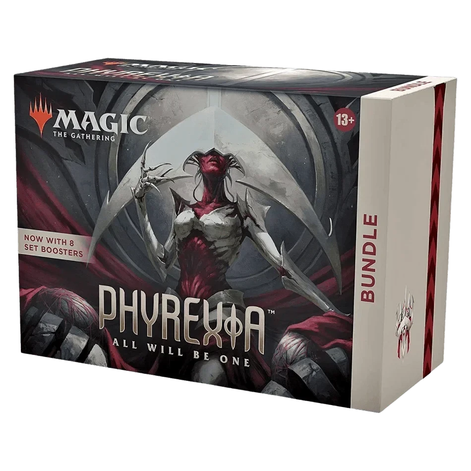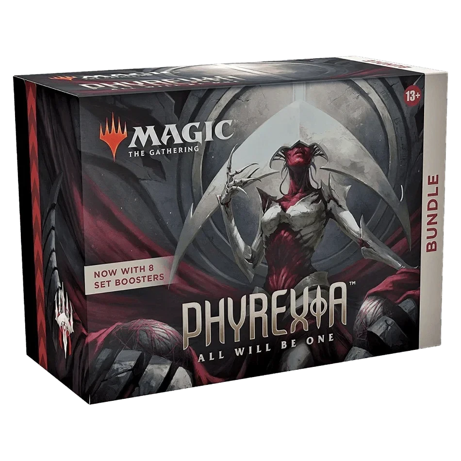 The Phyrexia: All Will Be One Bundle contains 8 Phyrexia: All Will Be One Set Boosters—the best boosters to open just for fun—plus accessories, with 1 traditional foil alternate-art promo card, 40 basic lands (20 traditional foils and 20 nonfoils), 1 oversized Spindown life counter, 1 card storage box, and 2 reference cards.