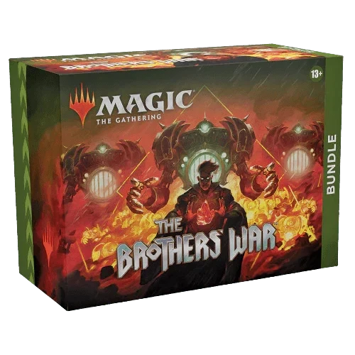 The Brothers’ War Bundle contains 8 The Brothers’ War Set Boosters—the best boosters to open just for fun—plus exclusive accessories, with 40 basic lands (20 traditional foils and 20 non-foils), 1 Traditional Foil promo card with Bundle-exclusive alternate art, 1 oversized Spindown life counter (red or green), 1 card storage box, and 2 reference cards.