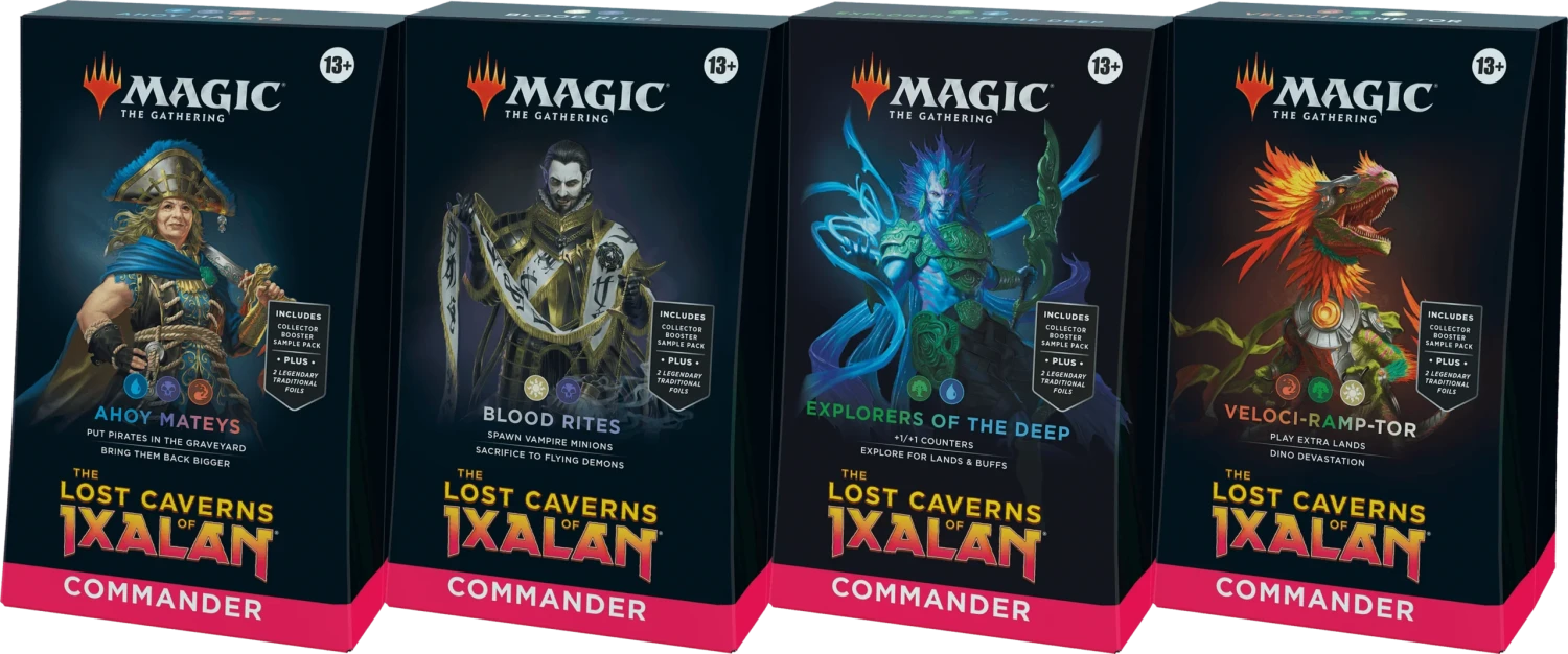 In Commander, four players come together to show their strength and strategy, with one player coming out on top. Each 100-card ready-to-play Lost Caverns of Ixalan Commander Deck makes it easy for Commander fans in your store to grab a deck and play right away.