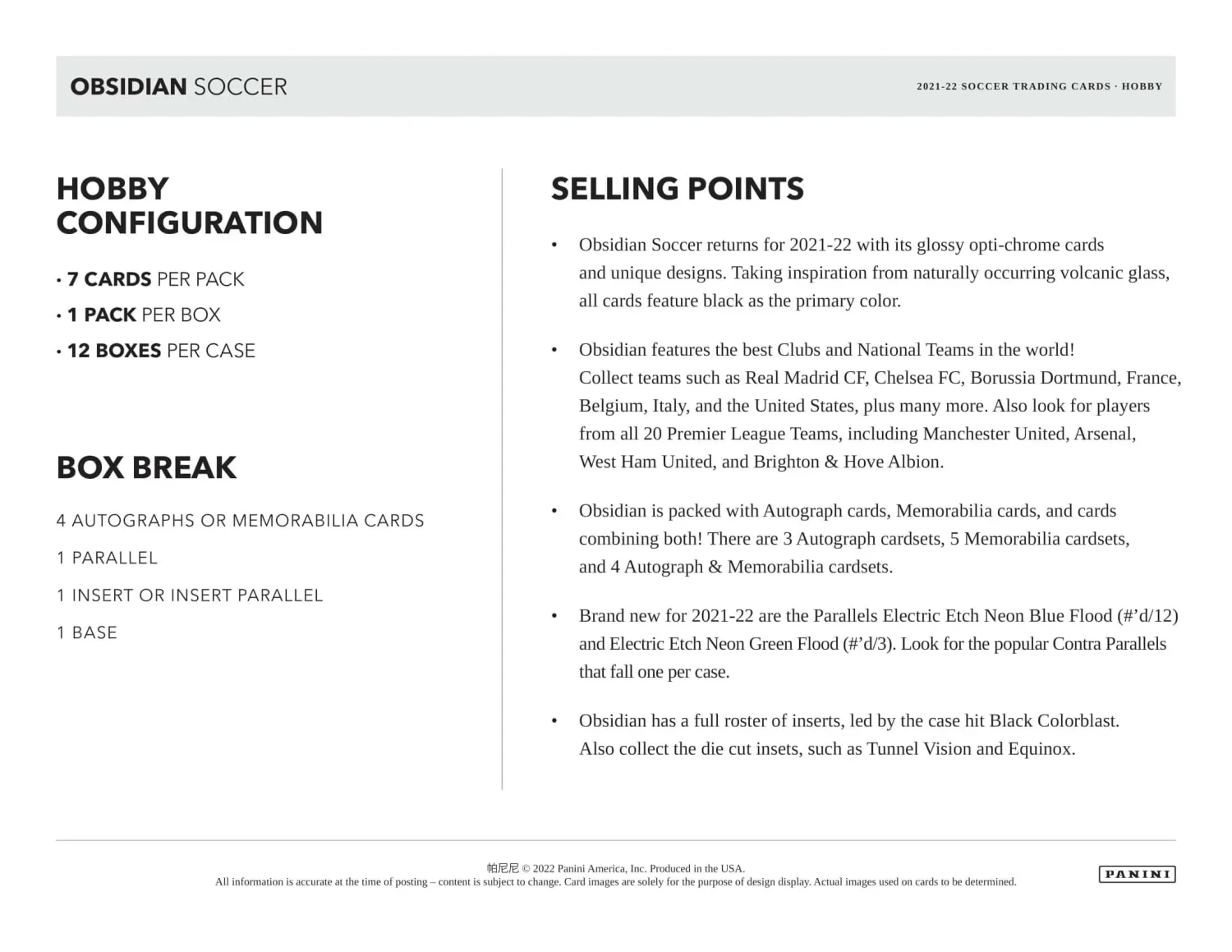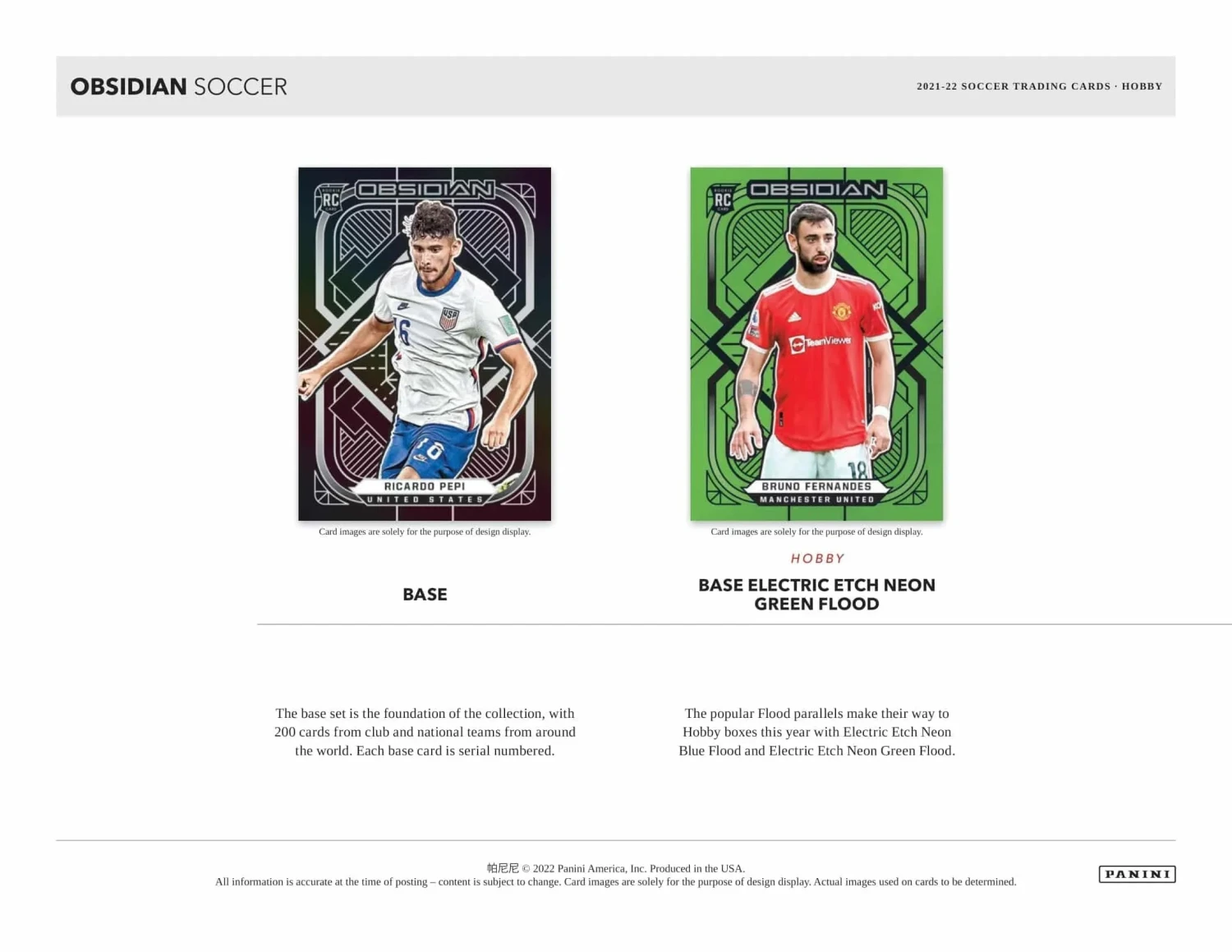 Obsidian Soccer returns for 2021-22 with its glossy opti-chrome cards and unique designs. Taking inspiration from naturally occurring volcanic glass, all cards feature black as the primary colour.