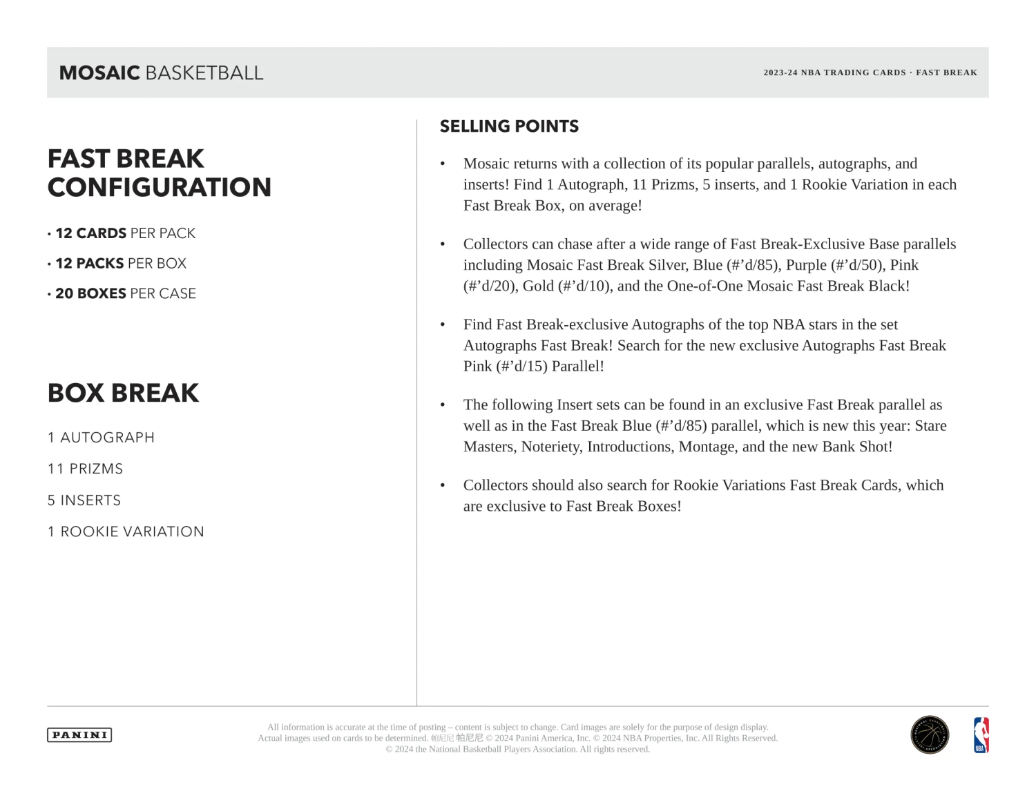 2023-24 Panini Mosaic Fast Break NBA Basketball Cards Cards PRODUCT HIGHLIGHTS: