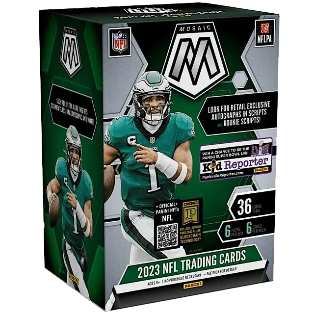 Panini presents the 2023 Panini Mosaic Football Blaster Box. Features a 380-Card set including 250 Base, 100 Base Rookies, 20 Base National Pride and 10 Base Hall of Fame. Blaster includes 6 packs of 6 cards per pack. Look for Retail Exclusive Autographs in scripts and Rookie Scripts! Look for Blaster Exclusive Mosaic Orange Fluorescent Parallels!