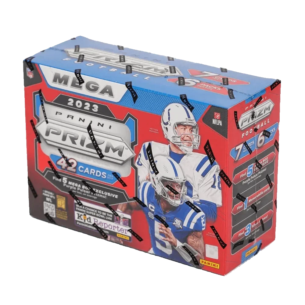 2023 Panini Prizm NFL Football Cards HOBBY MEGA BOX – One of the most-beloved brands in trading card history, Prizm Football returns for the 2023 season with its fabled stable of collection-making content including iconic Prizm parallels, and look for the opportunity to pull EXCLUSIVE PARALLEL AUTOGRAPHS and so much more!