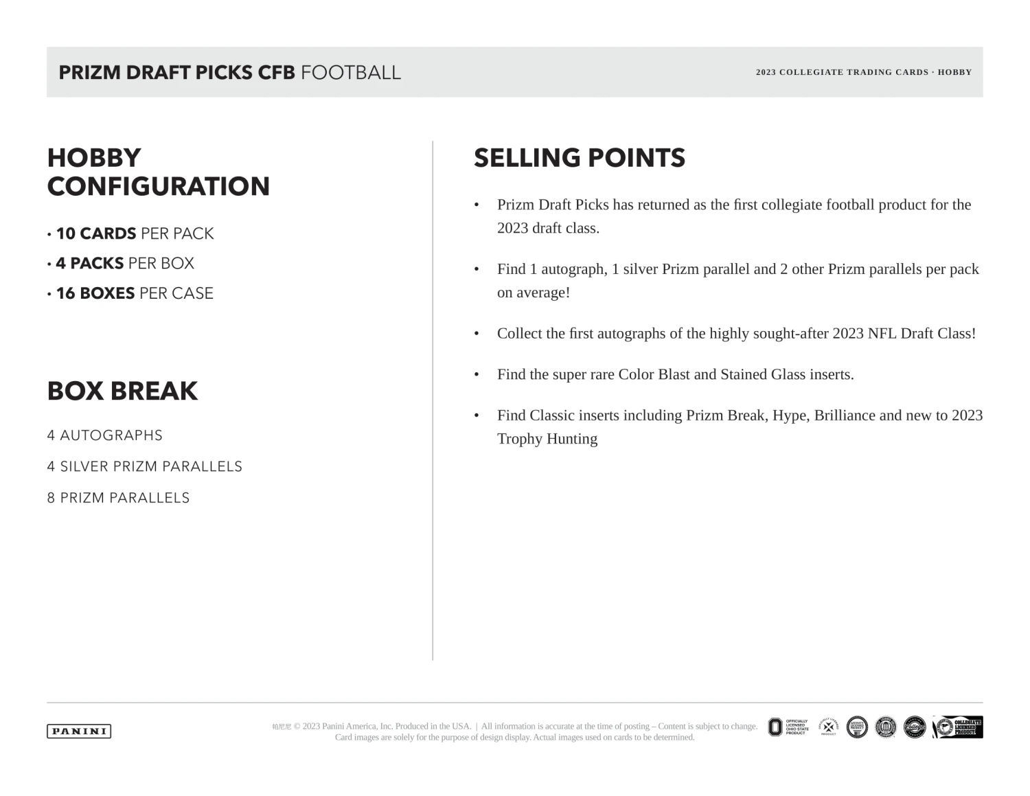 2023 Panini Prizm Draft Picks Collegiate Football Cards PRODUCT HIGHLIGHTS: