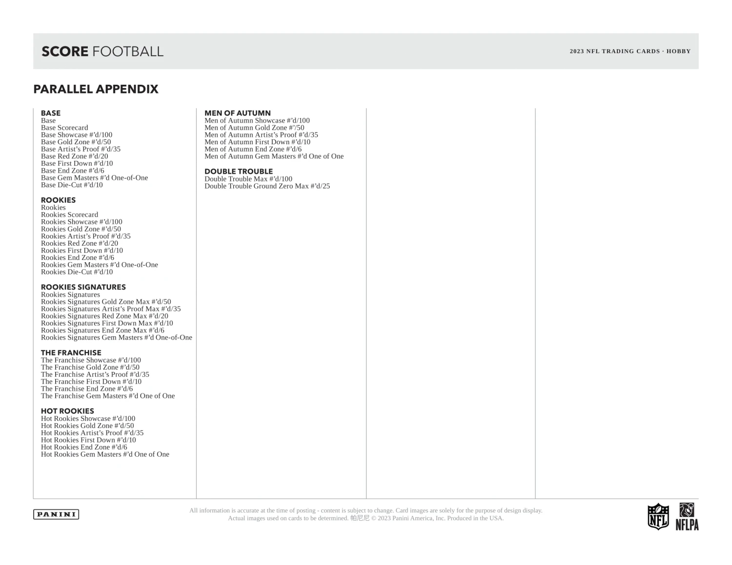 - Chase autographed parallels of the top rookies of the highly anticipated 2023 NFL Rookie Class! Also look for autographs of you favorite veteran players in Base Signatures.