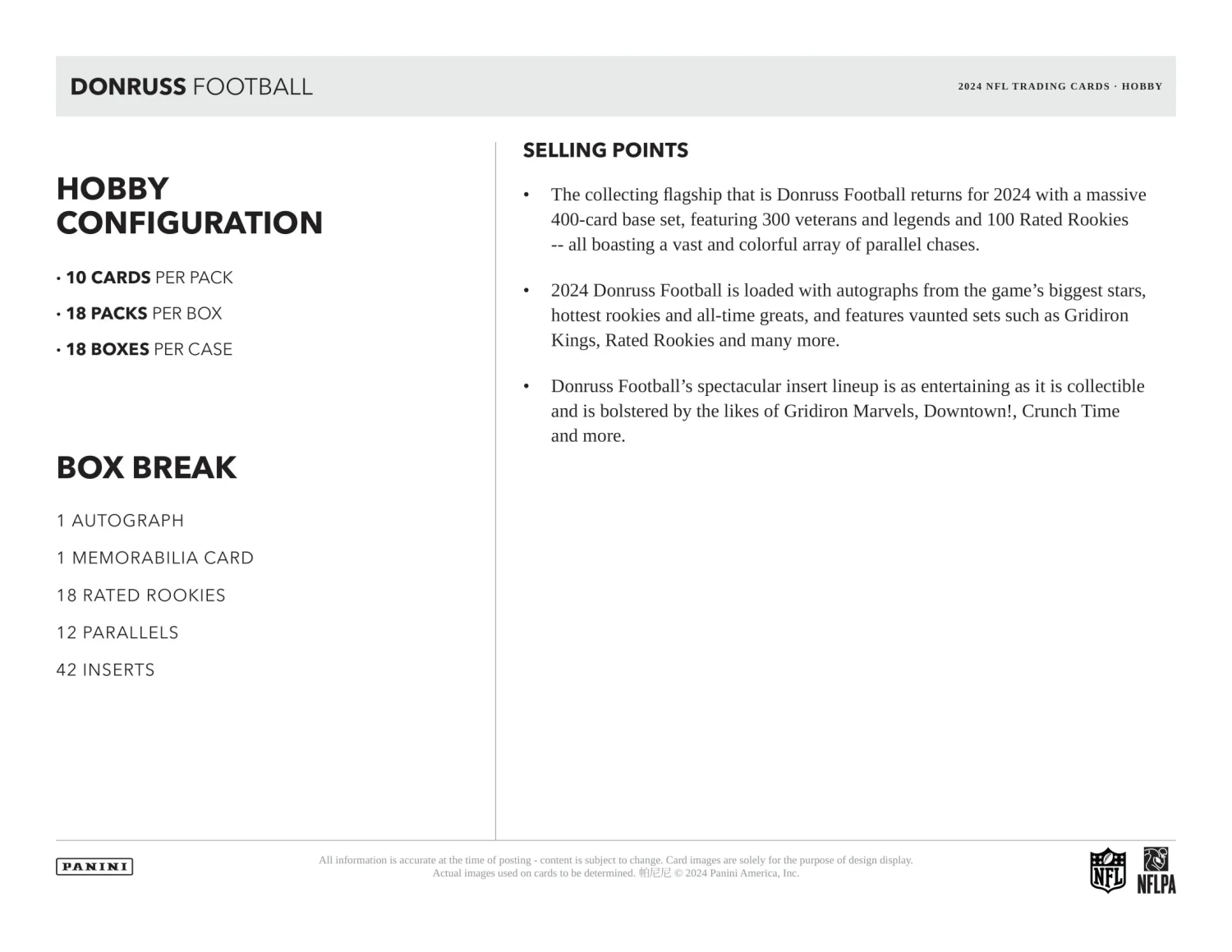 - 2024 Donruss Football is LOADED with autographs from the game’s biggest stars, hottest rookies and all-time greats, and features vaunted sets such as Gridiron Kings, Rated Rookies and many more.