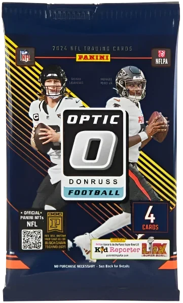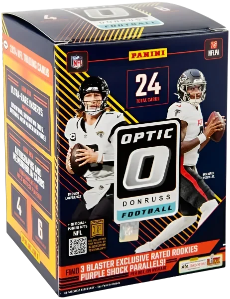 The flagship Donruss Football epically meets Optichrome technology with 2024 Donruss Optic Football, a dynamic product honoring the game’s top stars and hottest rookies. Featuring the Loaded 2024 Rookie Draft Class! Find 3 Blaster Exclusive Rated Rookies Purple Shock Parallels per box on average!