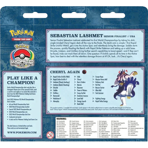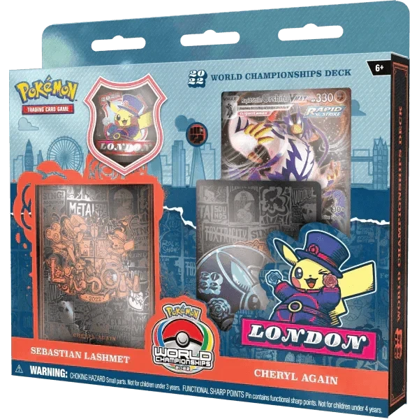 Grab a World Championships deck and play like a champion! Choose one of four powerful decks, each a card-for-card replica of an actual title-contender’s deck from the 2022 Pokémon Trading Card Game World Championships!