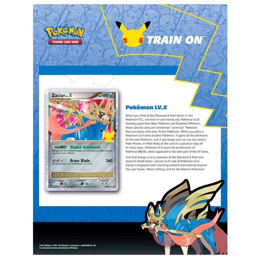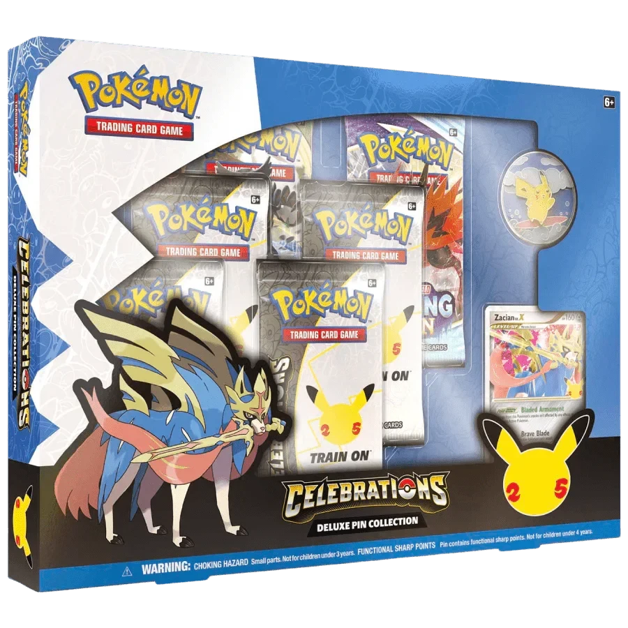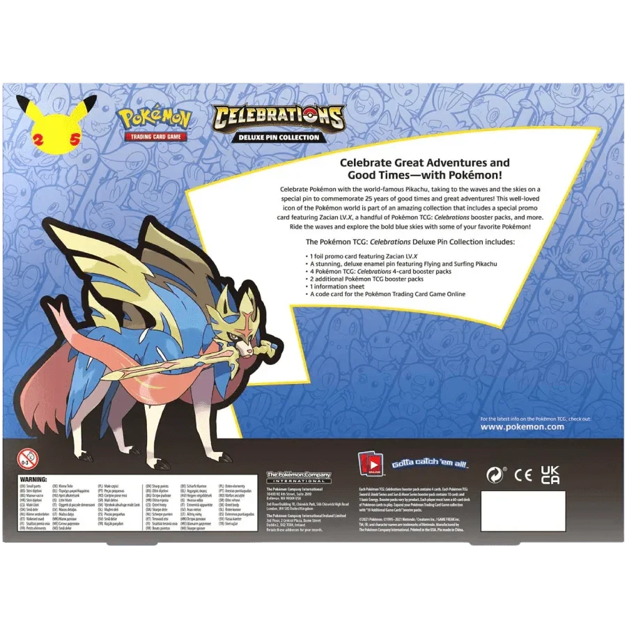 Celebrate Pokémon with the world-famous Pikachu, taking to the waves and the skies on a special pin to commemorate 25 years of good times and great adventures! This well-loved icon of the Pokémon world is part of an amazing collection that includes a special promo card featuring Zacian LV.X, a handful of Pokémon TCG: Celebrations booster packs, and more. Ride the waves and explore the bold blue skies with some of your favorite Pokémon!