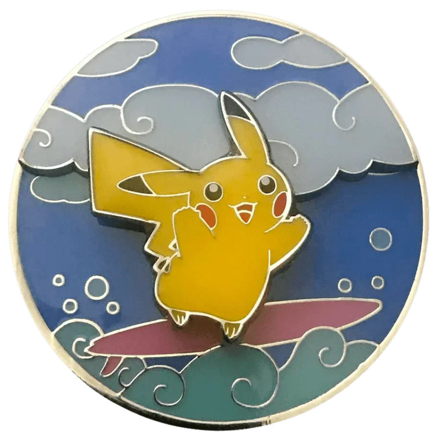 - A stunning, deluxe enamel pin featuring Flying and Surfing Pikachu