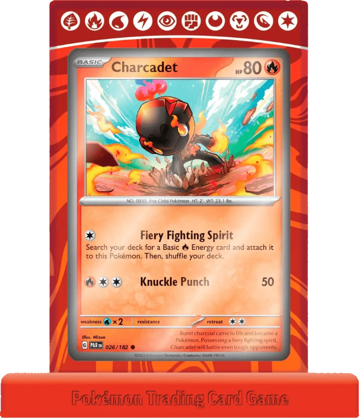 Armarouge ex’s armor is said to be the source of its incredible strength—but all those who underestimate its firepower will surely get burned! With a powerful Ability and attack, this Pokémon ex can up its defensive or offensive capabilities as it scorches its way through battles. Armarouge ex appears here as a playable etched foil promo card, and Charcadet and Ceruledge add more fuel to the inferno as foil promo cards.