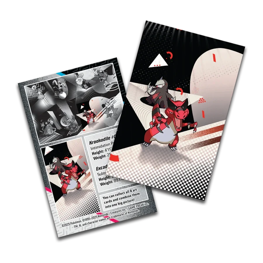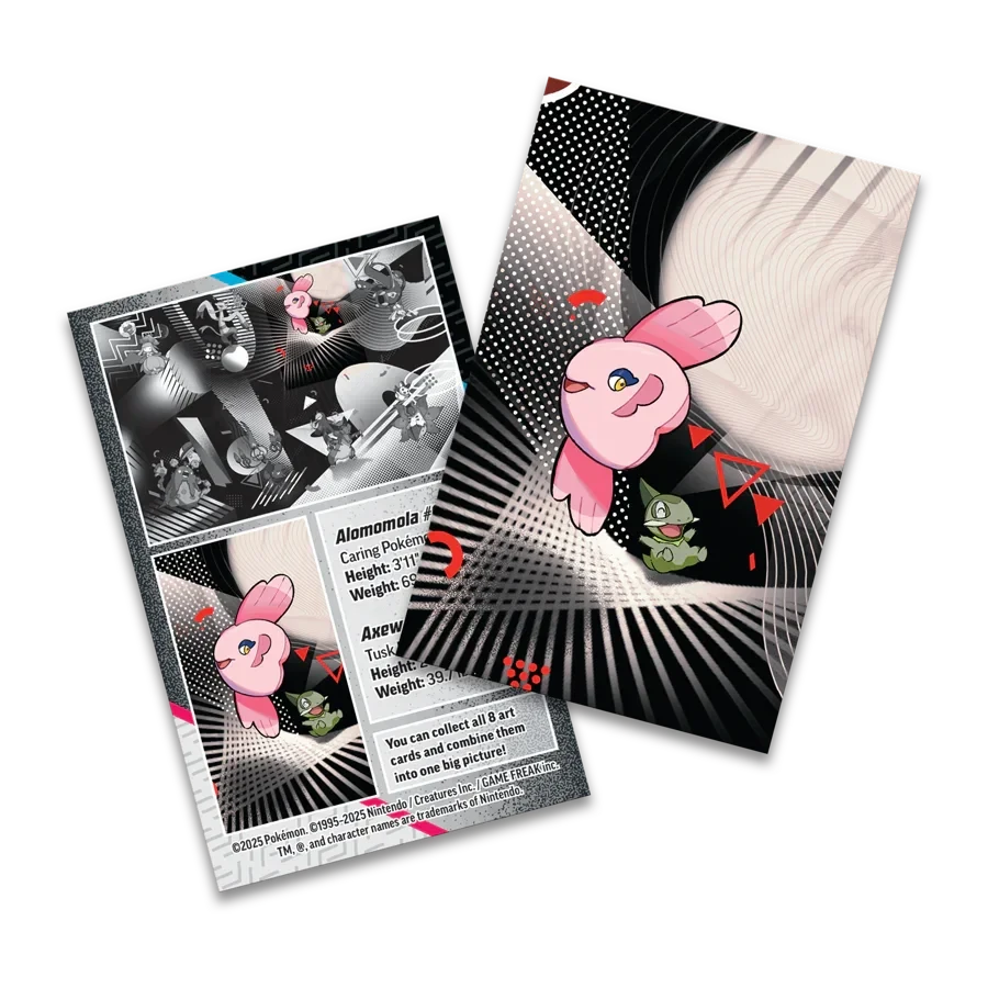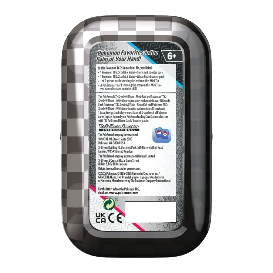 Includes one Scarlet & Violet—Black Bolt booster pack, one Scarlet & Violet—White Flare booster pack, one art card, and one sticker card matching the tin’s art.
