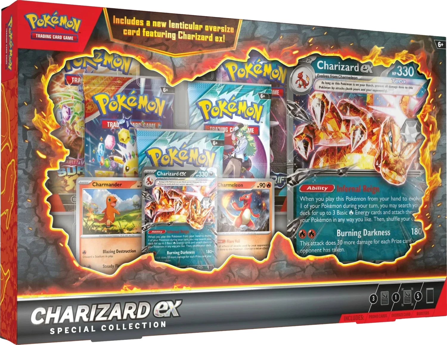 Charizard ex burns up the opposition’s lead with the cunning firepower of a Darkness-type Pokémon. Evolve it from Charmander and Charmeleon, then use its strong Ability and attack to make a roaring comeback. This fiery set also comes with 5 Pokémon TCG booster packs and an oversize lenticular card featuring the Flame Pokémon itself—move the card back and forth to see Charizard ex go on the attack!