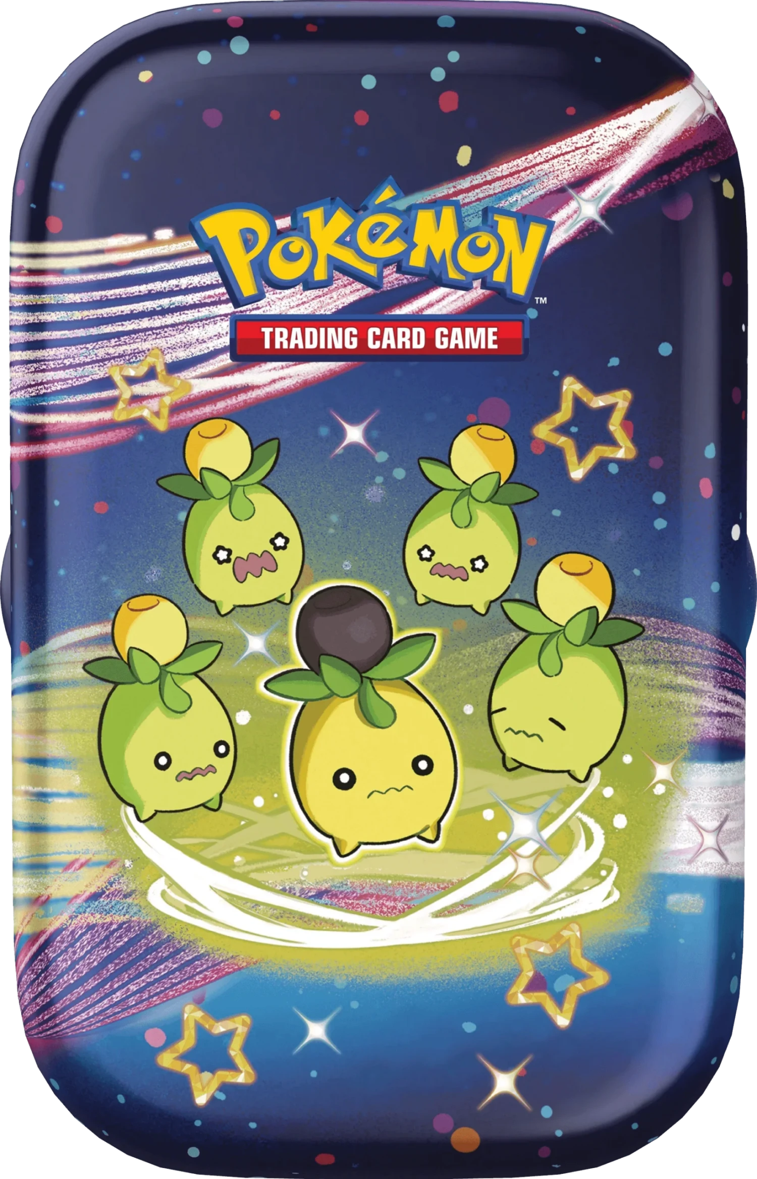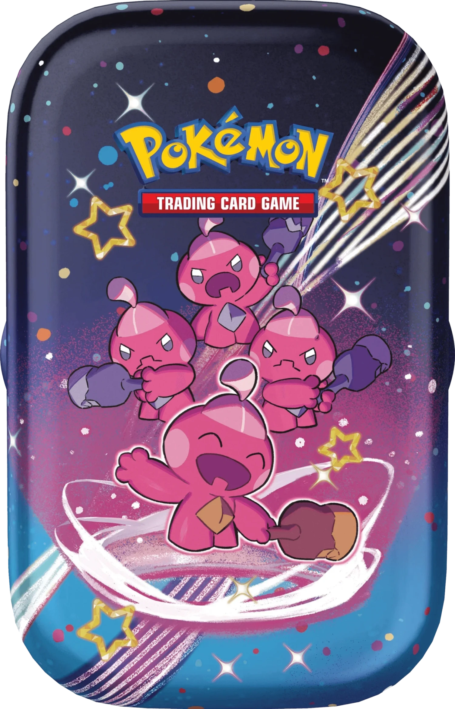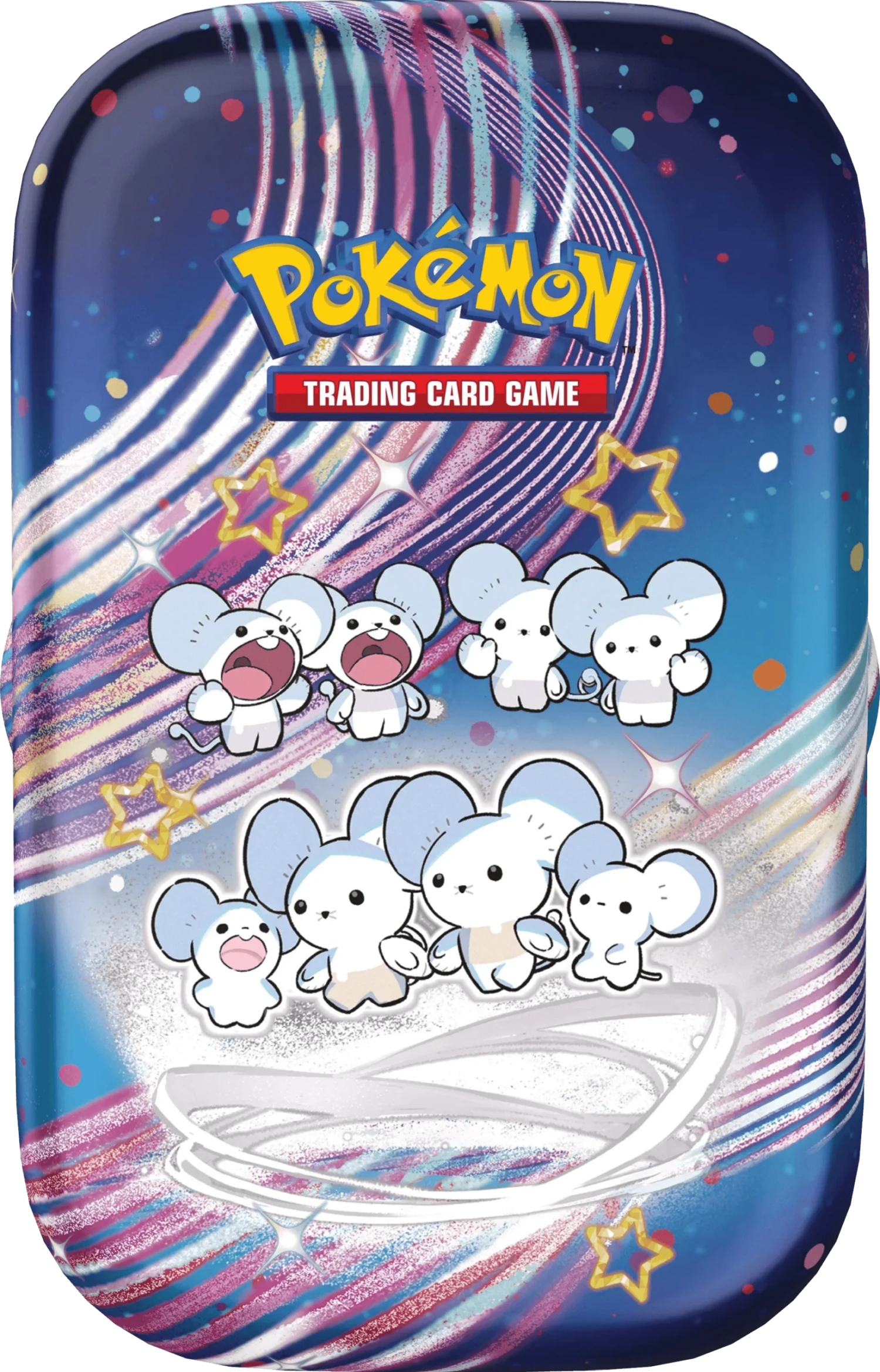 Includes two Scarlet & Violet—Paldean Fates booster packs, one sticker sheet and one art card matching the tin, featuring Maushold, Smoliv, Tinkatink, Finizen or Flamigo.