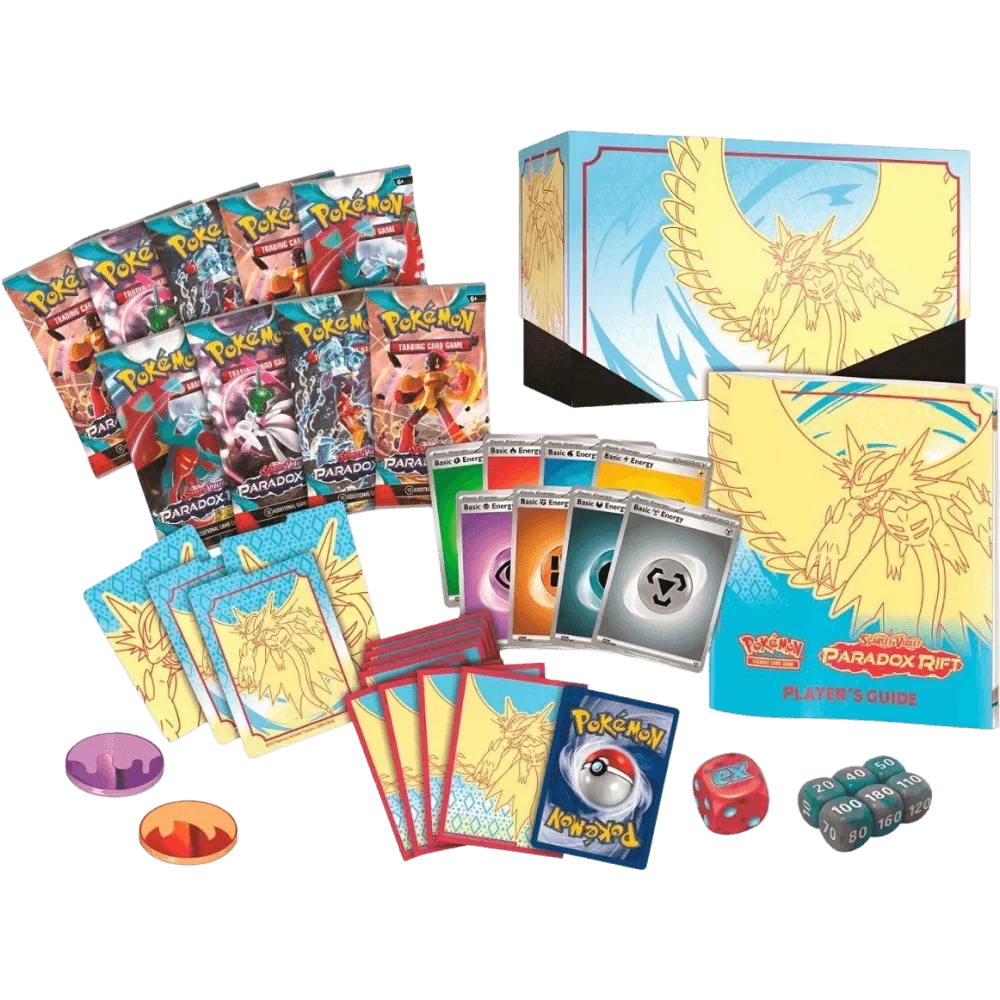 Looking for a boost to jump-start your Paradox Rift collection? The Elite Trainer Box includes 9 booster packs, 1 full-art foil promo card featuring either Scream Tail or Iron Bundle, 65 card sleeves featuring Roaring Moon or Iron Valiant, 45 Energy Cards, a player’s guide and rulebook, 6 damage-counter dice, 1 competition-legal flip coin and 2 condition markers, all contained in a stylish collector’s box. There’s even a code card for the Pokémon TCG Online!