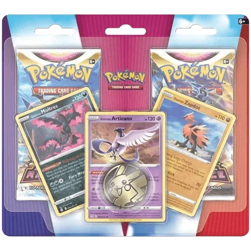 Jump-start your collection with two booster packs at once, plus additional cards featuring Galarian Zapdos, Moltres & Articuno!