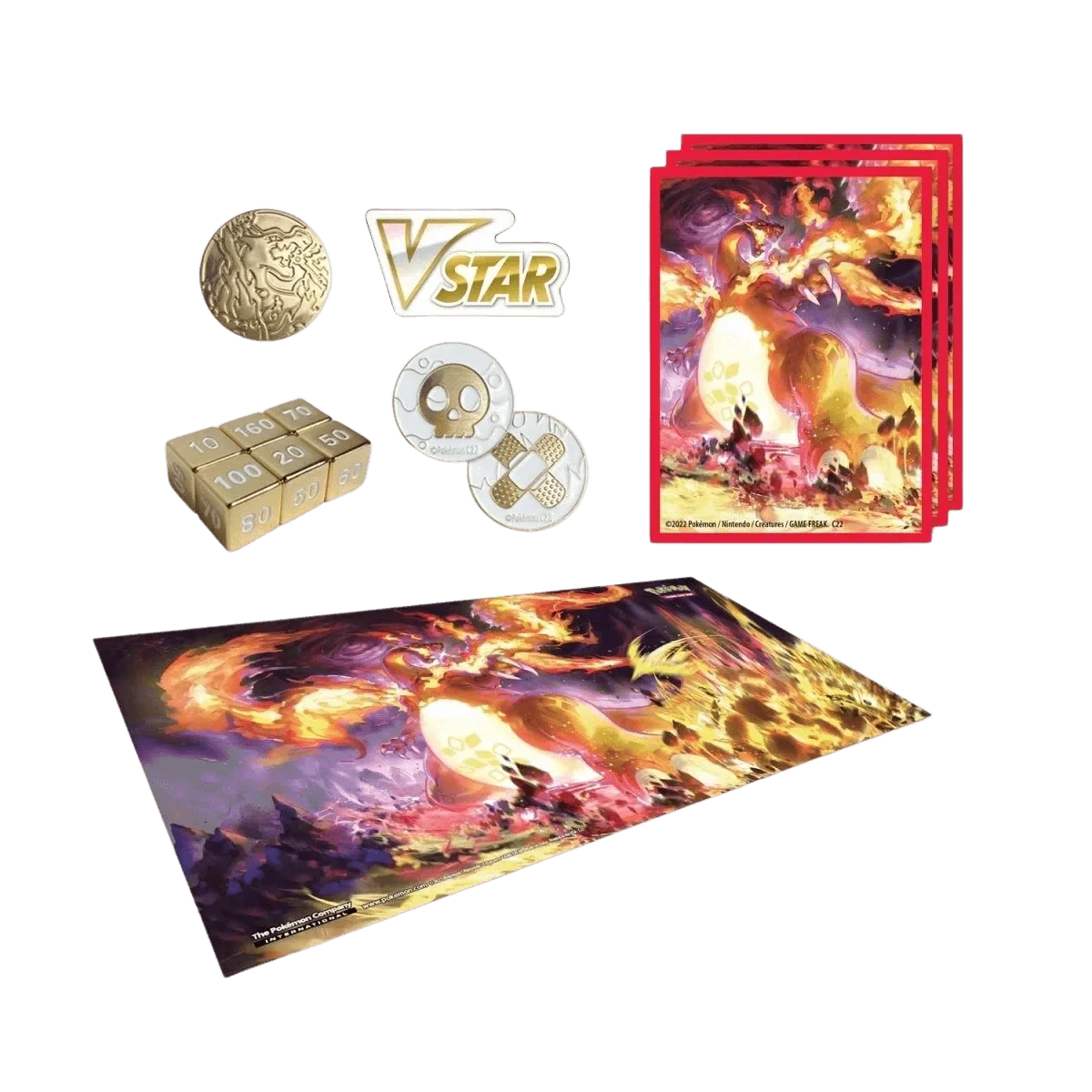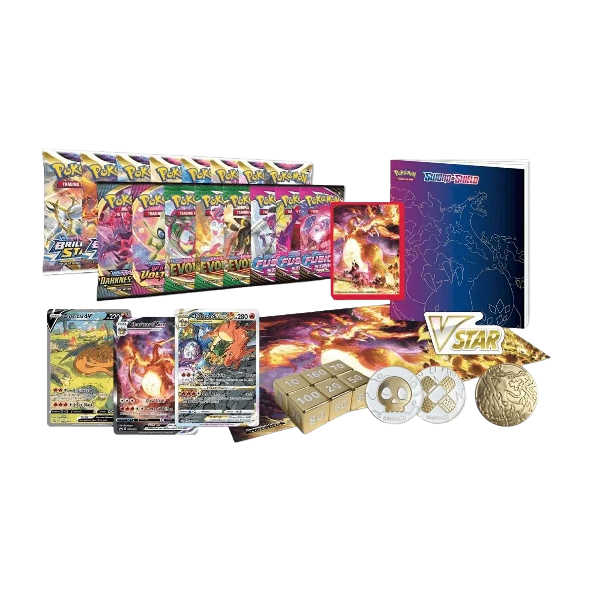Celebrate the Sword & Shield Series and the era of Pokémon V, Pokémon VMAX, and Pokémon VSTAR with a hotshot who knows how to put all that power to good use! Charizard turns up the heat as a trio of promo cards with an etched foil treatment, and its Gigantamax form shows off blazing style on a playmat, metal coin, and set of card sleeves. Metal dice and condition markers round out this ultimate set of gameplay accessories. And as you open the huge stack of booster packs inside this box, take a journey through the Sword & Shield Series with an original booklet full of images and stats!