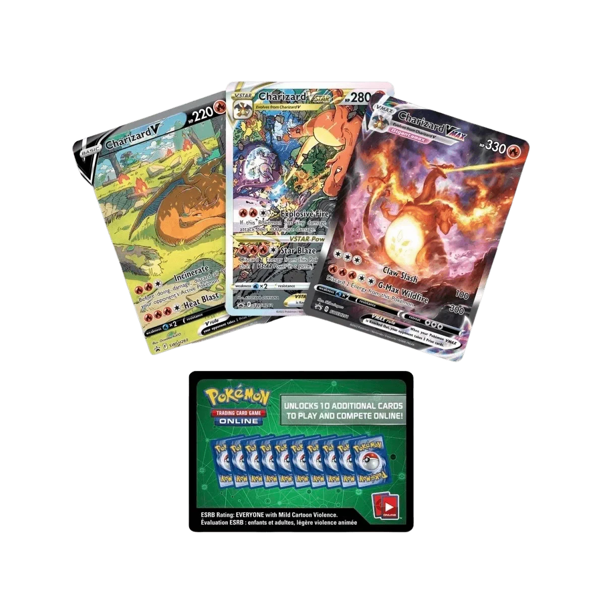 - 3 etched foil promo cards: Charizard V, Charizard VMAX, and Charizard VSTAR