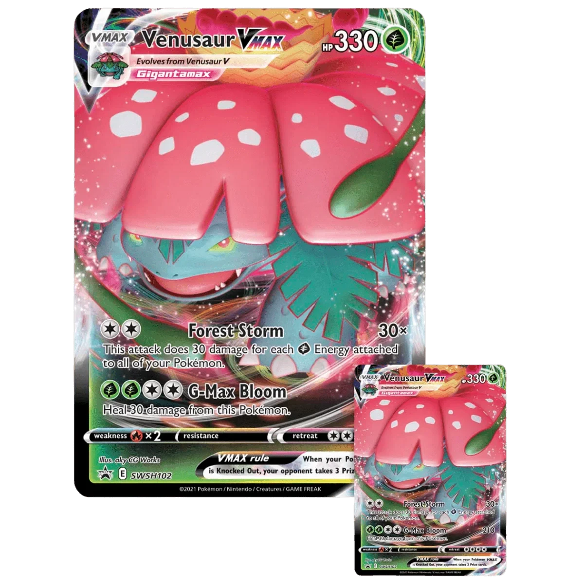 Venusaur VMAX is a solar-powered Pokémon that stays steady and strong in the face of fiery attacks, raging currents, or high-voltage blasts! Enhance your collection with this resilient Pokémon, and find helpful allies, skilled Trainers, and other treasures in Pokémon TCG booster packs. Venusaur VMAX uses its petals, vines, and blossoms in surprising ways, battling in its own unique Grass-type style!