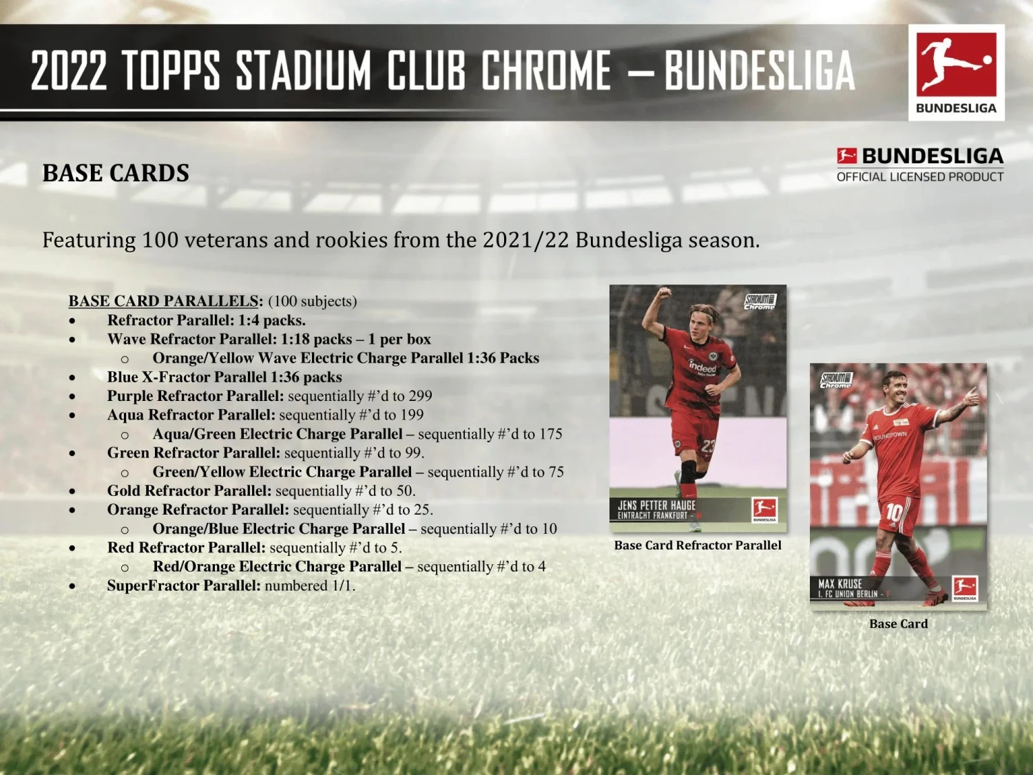 - Base Cards – Featuring 100 veterans and rookies from the 2021/22 Bundesliga season.