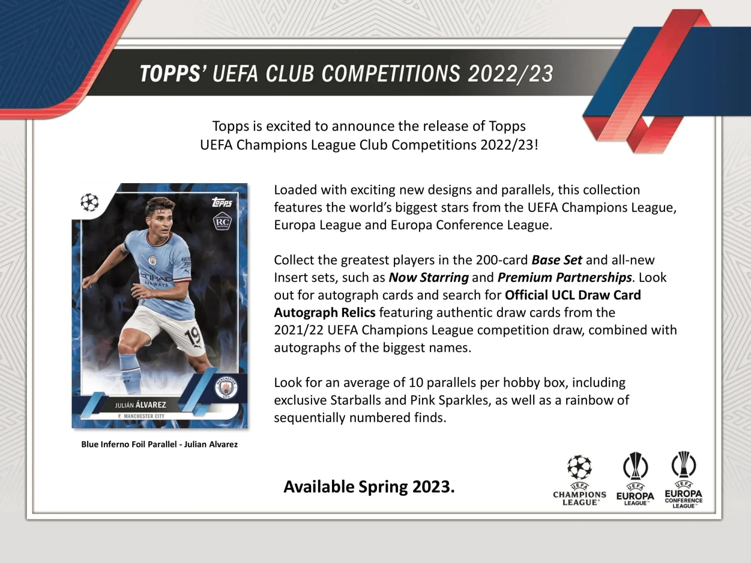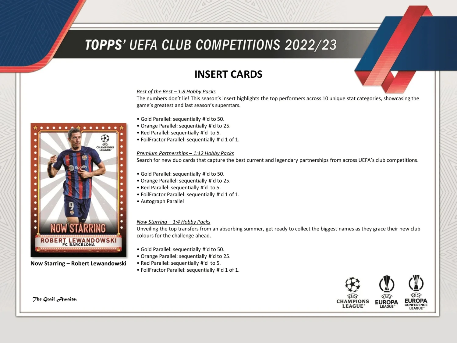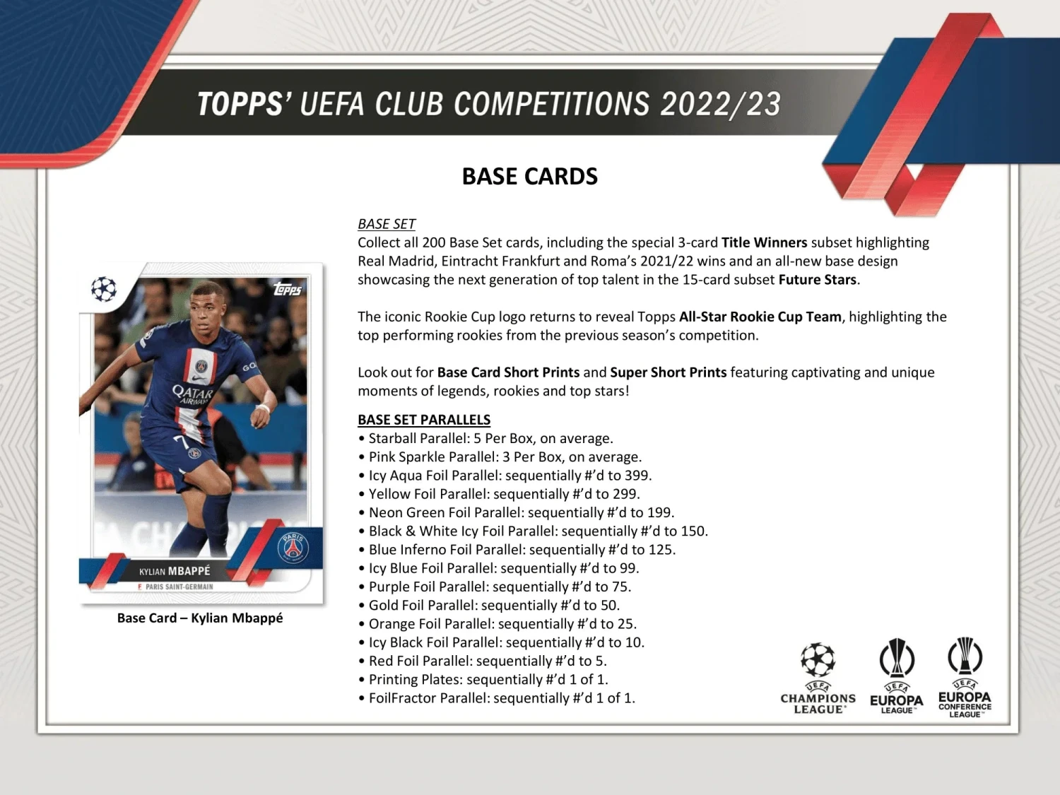 2022-23 Topps UEFA Club Competitions Soccer Cards delivers (21)Inserts (on average), (3) Pink Sparkle Parallels and (5) Starball Parallels in Every Box! This product is LOADED with exciting new designs and parallels! The collection features the world’s biggest starsfrom the UEFA Champions League, Europa League and Europa Conference League.