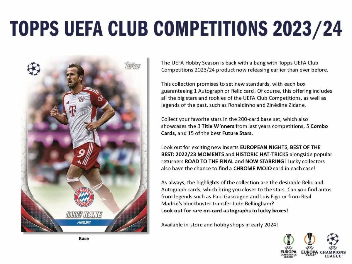 The 2023-24 UEFA Hobby Season is back with a bang with Topps UEFA Club Competitions product now releasing earlier than ever before. This collection promises to set new standards, with Each Box GUARANTEEING (1) Autograph or Relic Card! Of course, this offering includes all the big stars and rookies of the UEFA Club Competitions, as well as legends of the past, such as Ronaldinho and Zinédine Zidane.