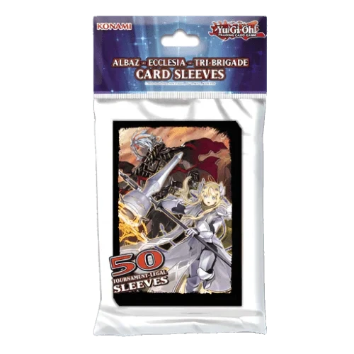 Official Yu-Gi-Oh! TRADING CARD GAME (TCG) Card Sleeves help Duelists keep their cards secure and protected during Duels. The Albaz – Ecclesia – Tri-Brigade Card Sleeves feature the artwork of Fallen of Albaz and Dogmatika Ecclesia, the Virtuous, both of which made their debut in the core booster set, Rise of the Duelist. These Card Sleeves are perfect for keeping your cards safe when Dueling against destructive forces! Each pack contains 50 card sleeves specifically designed to meet tournament regulation standards for the Yu-Gi-Oh! TCG.